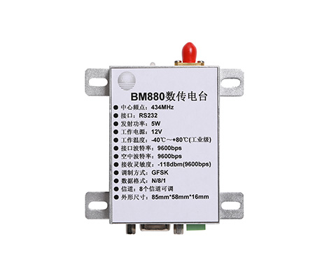 BM880高速率無線數傳電臺,是一種遠距離無線數據傳輸產品,它體積小,金屬外殼,屏蔽性能好,抗干擾性強,內部采用集成功放,TCXO等高可靠性器件,內置看門狗,產品的穩定性及可靠性極高。采用先進的GFSK調制方式,提高了頻率資源的利用率和產品的抗干擾能力,半雙功的通訊方式,能方便為用戶提供雙向的數據信號傳輸、檢測和控制。收發時間小于18mS(9600bps通訊數率),適時性強。適合用于無線數據采集、工業控制、油田測控、水紋監測等重要領域。